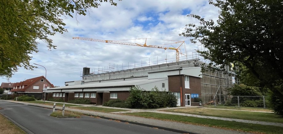 Im Rahmen der geplanten Anbaumaßnahmen an der Dreifachsporthalle Hopsten sind bauliche Mängel am bestehenden Hallendach festgestellt worden. Die Sporthalle, ursprünglich in den 1970er Jahren mit einem Flachdach errichtet, war in den 1990er Jahren aufgrund von Undichtigkeiten mit einem Satteldach überbaut worden. Nun wird das komplette Dach im Zuge der aktuellen Baumaßnahmen grundlegend erneuert.