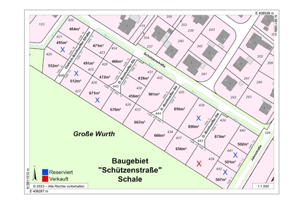 Reserviert sind derzeit 3 Grundstücke (blaues Kreuz).